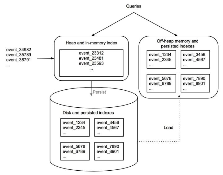 Druid的类 LSM-tree架构中的实时节点( Realtime Node)负责消费实时数据,与经典LSM-tree架构不同的是, Druid不提供日志及实行 WAL原则,实时数据首先会被直接加载进实时节点内存中的堆结构缓存区 (相当于 memtable),当条件满足时,缓存区里的数据会被冲写到硬盘上形成一个数据块 (Segment Split),同时实时节点又会立即将新生成的数据块加载到内存中的非堆区,因此无论是堆结构缓存区还是非堆区里的数据,都能够被查询节点(Broker Node)查询。