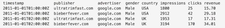 - 同维度列的值做聚合:所有维度列的值都相同时,这一类行数据符合聚合操作,比如对于所有维度组合“publisheradvertisergendercountry”维度值同为“http://ultratrimfast.comhttp://google.com Male USA”或同为“http://bieberfever.comhttp://google.com Male USA”的行。