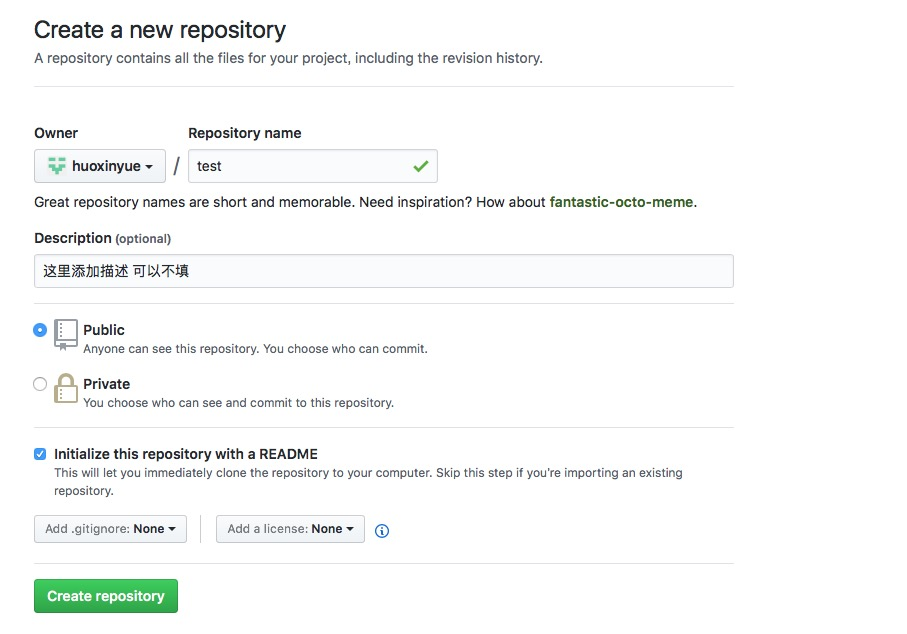 1、去github上创建自己的Repository,创建页面如下图所示: