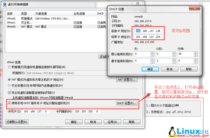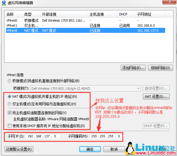 你以为设置完了??? 还没有,因为你不知道 vm的 虚拟dhcp服务器给你划分的有效ip地址范围,所以这一步,知识查看,并不需要设置。 还是打开虚拟网络编辑器(切记知识查看不是设置,最后点击取消。)