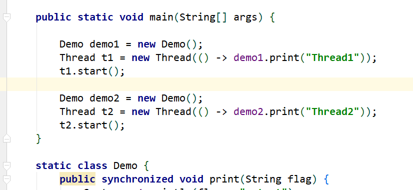 package com.helianxiaowu.demo;/*** @title synchronized同步demo* @desc 注意:为了演示方便,代码中多线程使用直接new的方式,这种方式不可取,会造成服务器资源消耗。* 工作中如果用到多线程,尽量使用线程池维护线程* @author helianxiaowu* @date 2020/1/14 上午 11:12*/public class SynchronizedDemo {public static void main(String[] args) {Demo demo = new Demo();// 启用两条线程Thread t1 = new Thread(() -> demo.print("Thread1"));Thread t2 = new Thread(() -> demo.print("Thread2"));t1.start();t2.start();}static class Demo {public void print(String flag) {System.out.println(flag + " start");try {Thread.sleep(3000);} catch (InterruptedException e) {e.printStackTrace();}System.out.println(flag + " end");}}}