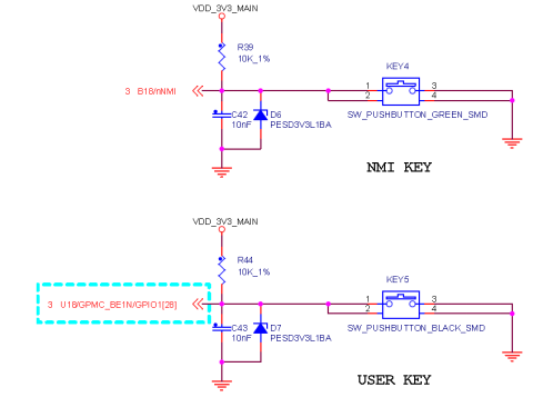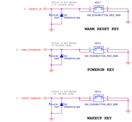 5个按键包含1个复位按键KEY1,1个长按睡眠按键KEY2,1个唤醒按键KEY3,2个可编程输入按键(含1个非屏蔽中断按键)KEY4和KEY5。其硬件位置及原理图如下图所示:
