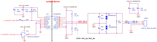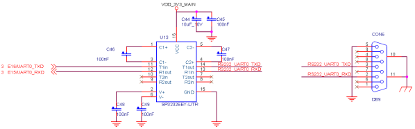 开发板上共引出了3个串口,分别为CON4、CON6、CON8,其中CON4为Micro USB调试串口(UART3)、CON6为RS232串口(UART0)、CON8为RS485串口(UART1)。其硬件位置及原理图如下图所示: