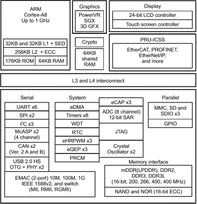 TI Sitara AM335x是一款高性能嵌入式32位工业级Cortex-A8处理器,主频可高达1GHz,运算能力可高达2000DMIPS,搭配DDR3,兼容eMMC和NAND FLASH,拥有多种工业接口资源,以下是AM335x CPU资源框图: