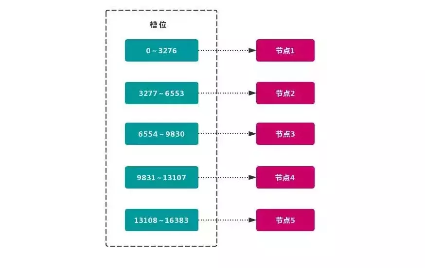 当前集群有 5 个节点,每个节点平均大约负责 3276 个槽。由于采用高质量的哈希算法,每个槽所映射的数据通常比较均匀,将数据平均划分到 5 个节点进行数据分区。Redis Cluster 就是采用虚拟槽分区。