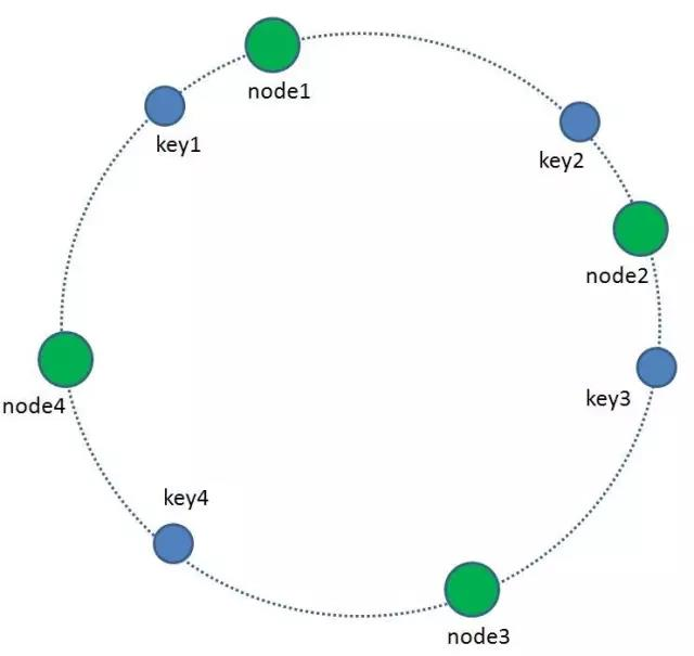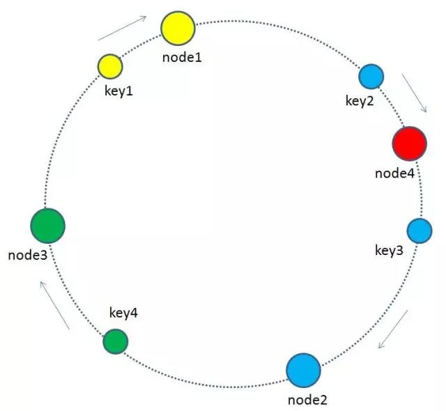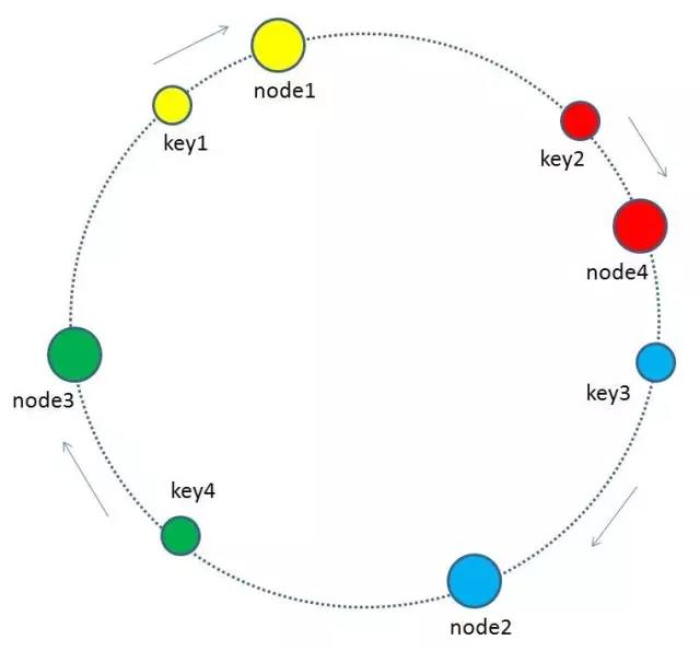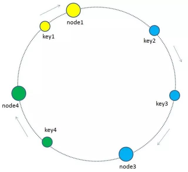 4、如何让key和节点对应起来呢?很简单,每一个key的顺时针方向最近节点,就是key所归属的存储节点。所以图中key1存储于node1,key2,key3存储于node2,key4存储于node3。