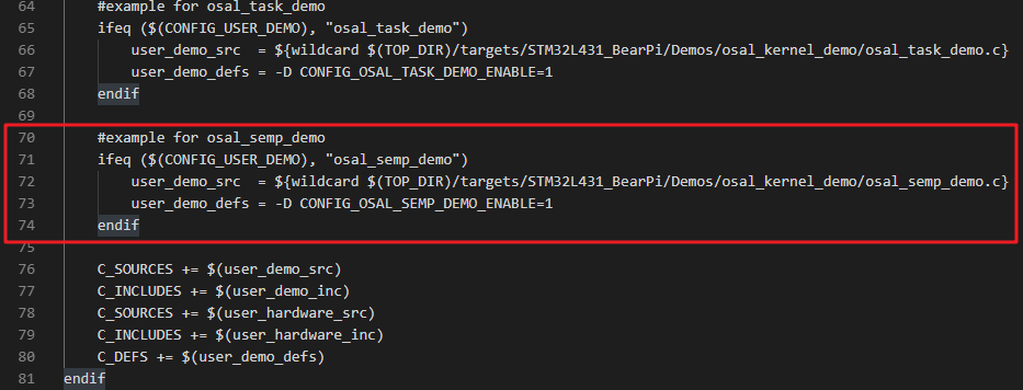 如果 CONFIGUSERDEMO 宏定义的值是osal_semp_demo,则将osal_semp_demo.c文件加入到makefile中进行编译。