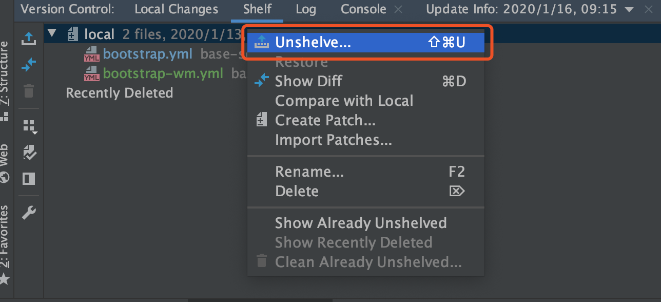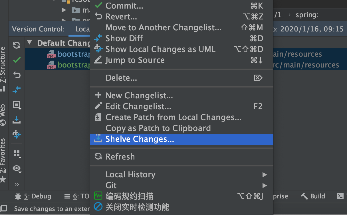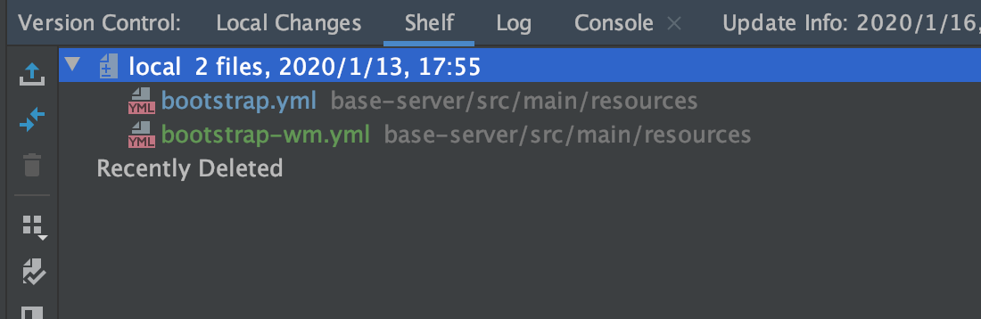 还有本地开发时,每个人都有自己的namespace,所以bootsrap根文件都会配置自己的active及codingfly配置。每次git提交更新会有一些繁琐。其实这个问题也很简单,我们可以使用idea提供的缓存功能。将我们自己的配置文件缓存起来。