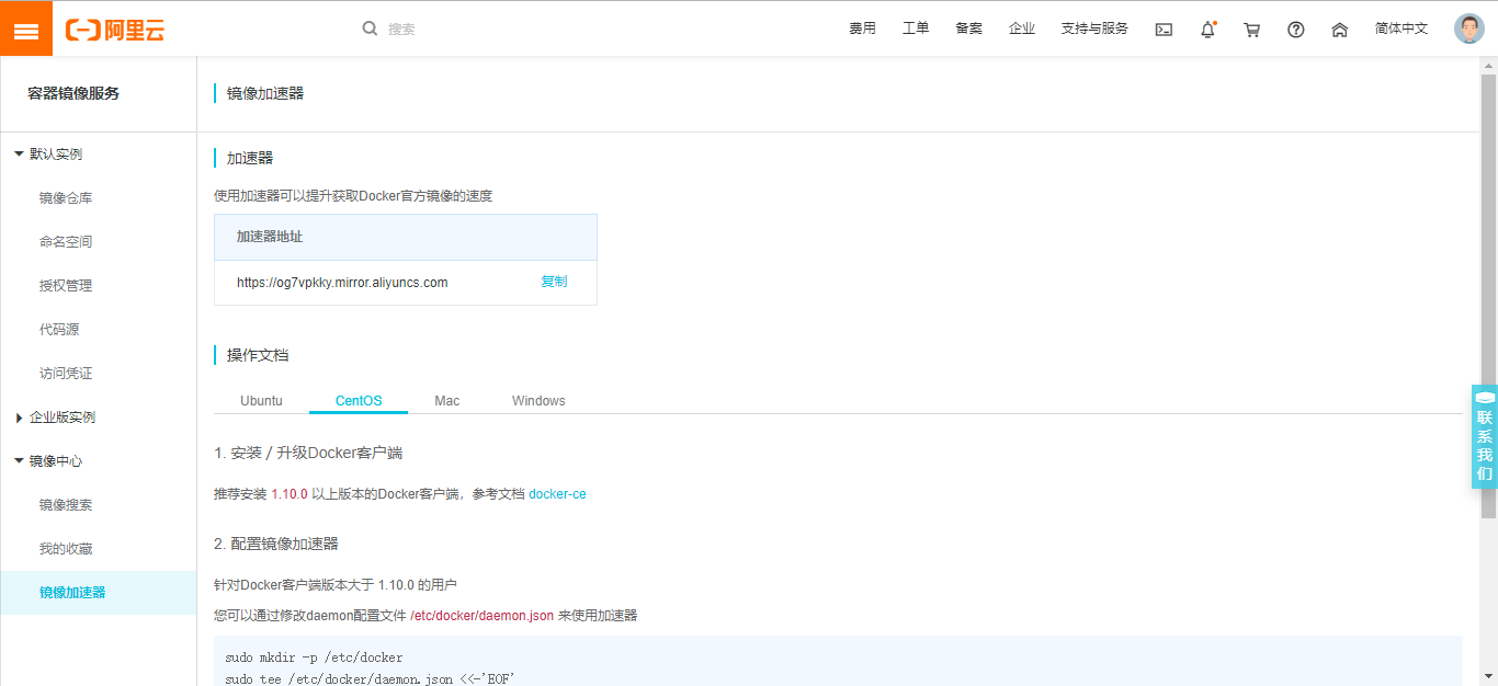 选择镜像加速器,就可以看到你的专属加速地址了。