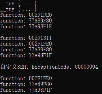 printf("自定义SEH: ExceptionCode: %X\n", ExceptionRecord->ExceptionCode);