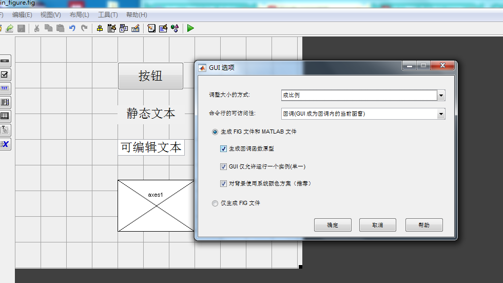 原始状态,不可放大和缩小 修改工具中的GUI选项,调整大小的方式为成比例 但是字体不会大小不会改变,将每个控件属性中的FontUnits 由points改为normalized,即可实现字体随着界面的放大和缩小而改变 来源:CSDN作者:光着脚丫丫丫丫丫链接:https://blog.csdn.net/cuicui666666/article/details/104034032 标签 gui