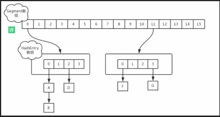 在JDK1.7版本中,ConcurrentHashMap的数据结构是由一个Segment数组和多个HashEntry组成,主要实现原理是实现了锁分离的思路解决了多线程的安全问题。Segment数组的意义就是将一个大的table分割成多个小的table来进行加锁,也就是上面的提到的锁分离技术,而每一个Segment元素存储的是 HashEntry数组+链表,这个和HashMap的数据存储结构一样。 如下图所示: