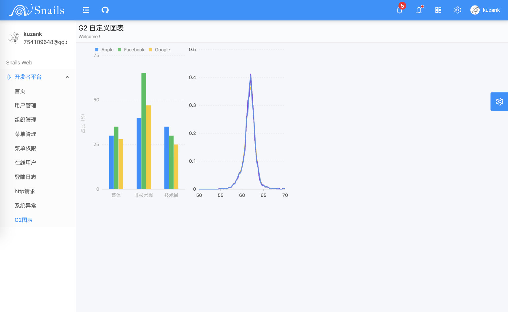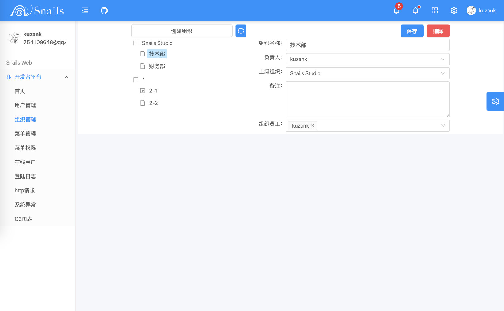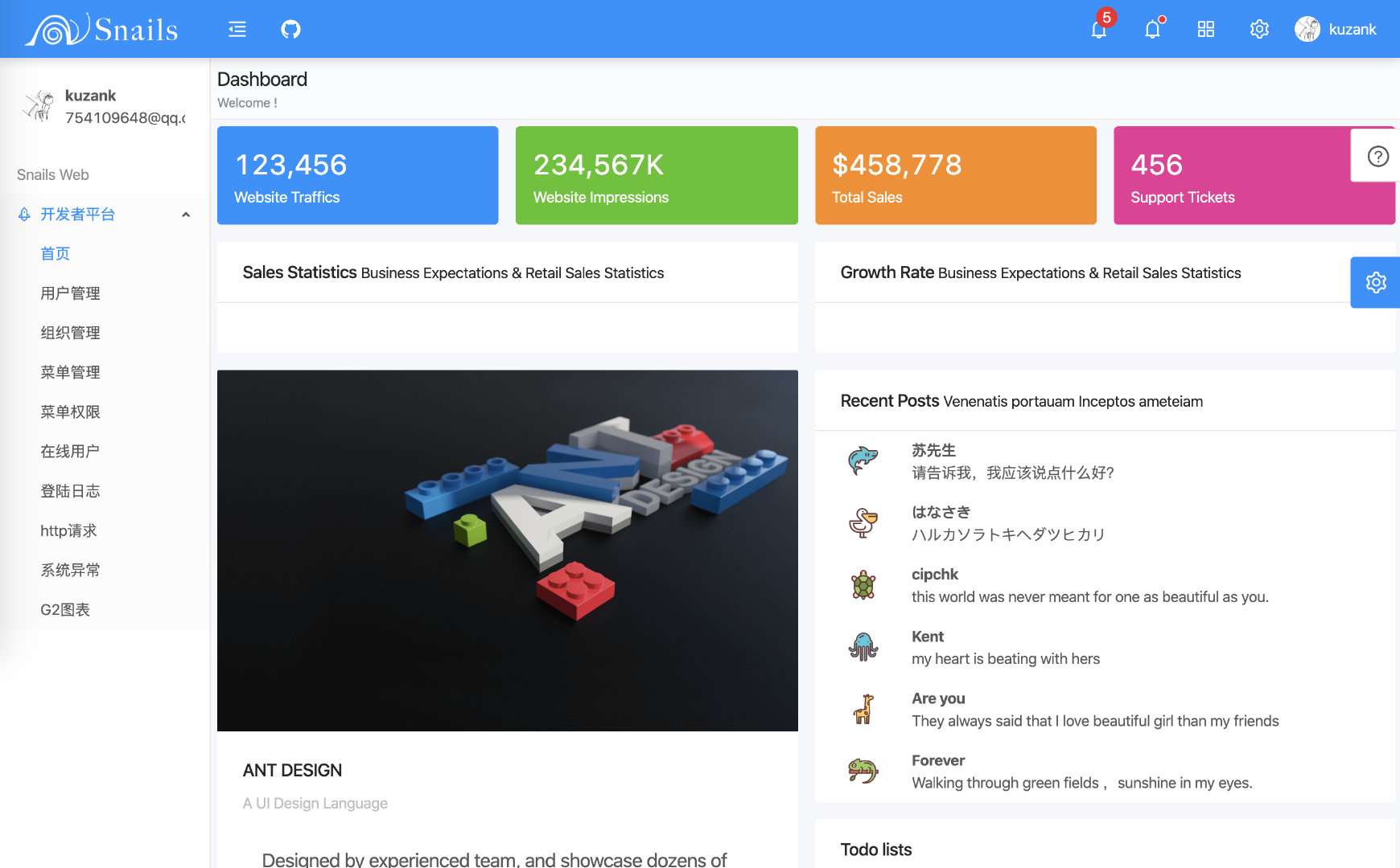 基于 SpringBoot + Ng-Alain 前后端分离的实现,可以作为新手入门项目,也可以作为小项目的基础框架去扩展。目前 Snails 系统框架已支持基本的后台功能,基于简单、实用设计,并且已支持 Docker 进行项目部署。