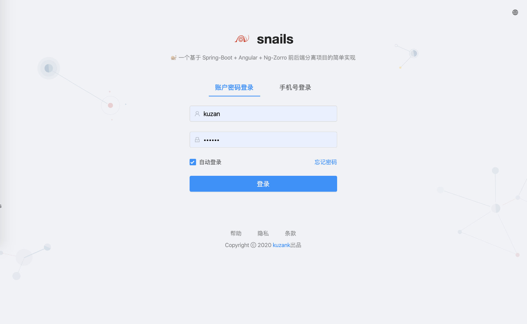 4.1、登陆页面,账号:kuzank,密码:123456