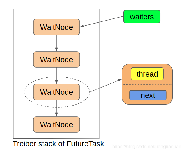 由于FutureTask中的队列本质上是一个Treiber栈,那么使用这个队列就只需要一个指向栈顶节点的指针就行了,在FutureTask中,就是waiters属性,事实上,它就是整个单向链表的头节点