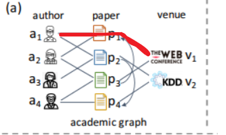 对于异构图,由于GNN只用于处理同构图,因此效果不好。(什么是异构图呢?下面这张图清楚的展示了异构图:在一个图中,节点类型数大于1,如author类型,paper类型,venue类型;边的类型数大于1,如author-paper边,paper-venue边;这样存在不同的节点类型和边类型的图就是异构图)