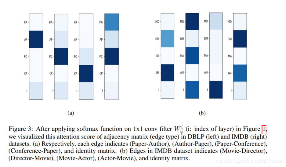 训练过程中某一次W的值如下图所示,在下图中可以看到,1*1的卷积核给A中每一种类型的边赋予一个权值(或者说是分值),通过这种attention机制来判断边对于最终生成meta-path的影响程度。