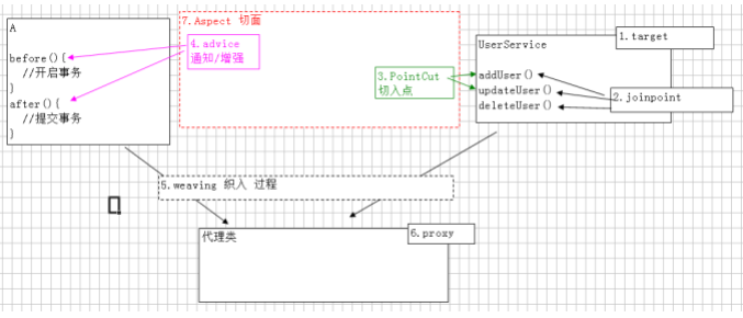 Weaving(织入):是指把增强advice应用到目标对象target来创建新的代理对象的过程。