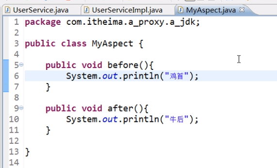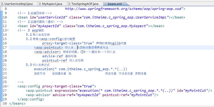 目标类和切面类写好后,需要把切面类和目标类融合在一起,这件事交给spring来完成。之前是从工厂中拿数据,现在要从配置文件中取数据。