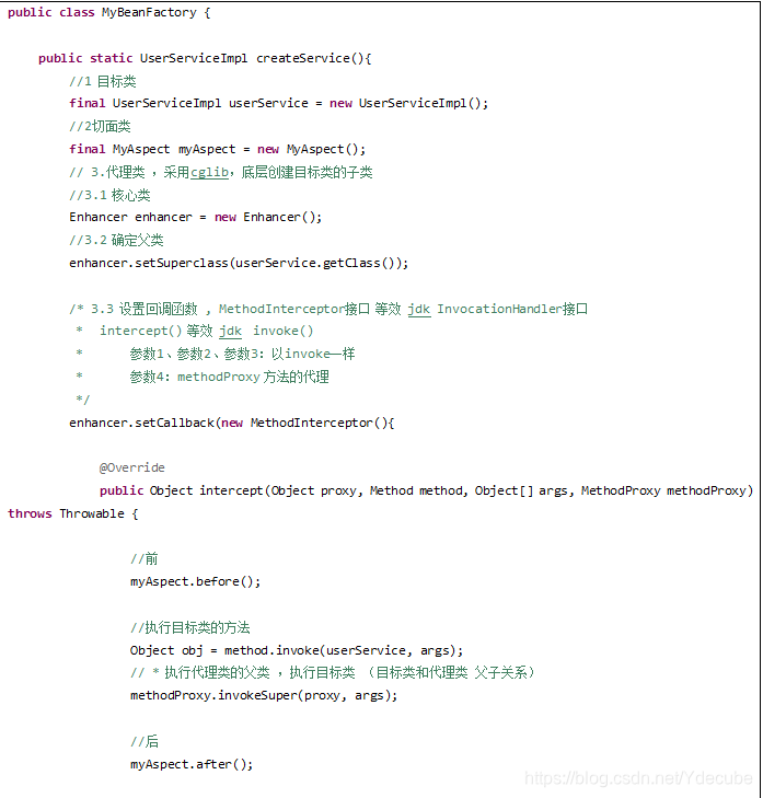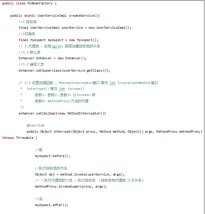 - 采用字节码增强框架 cglib,在运行时创建目标类的子类,从而对目标类进行增强