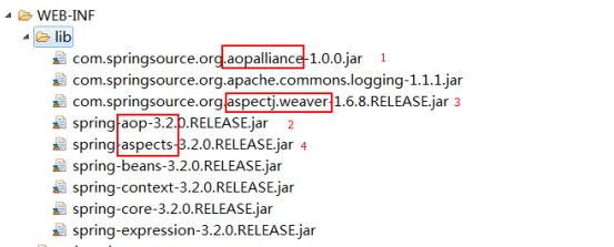 导入jar包:4个(aop联盟规范、spring aop实现、aspect规范、spring aspect实现)