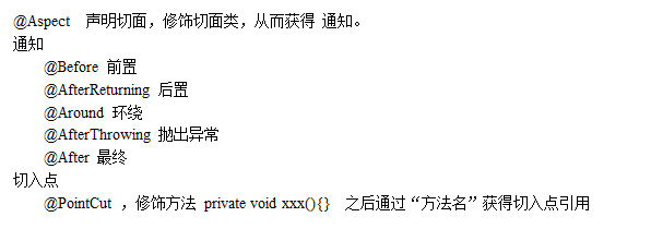 - @AspectJ是AspectJ1.5新增功能,通过 JDK5注解技术,允许直接在Bean类中定义切面。新版本Spring框架,建议使用AspectJ方式来开发AOP。