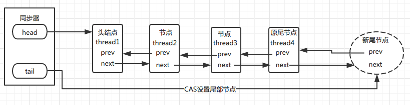 - 同步队列设置尾节点(未获取到锁的线程加入同步队列): 同步器AQS中包含两个节点类型的引用:一个指向头结点的引用(head),一个指向尾节点的引用(tail),当一个线程成功的获取到锁(同步状态),其他线程无法获取到锁,而是被构造成节点(包含当前线程,等待状态)加入到同步队列中等待获取到锁的线程释放锁。这个加入队列的过程,必须要保证线程安全。否则如果多个线程的环境下,可能造成添加到队列等待的节点顺序错误,或者数量不对。因此同步器提供了CAS原子的设置尾节点的方法(保证一个未获取到同步状态的线程加入到同步队列后,下一个未获取的线程才能够加入)。 如下图,设置尾节点: