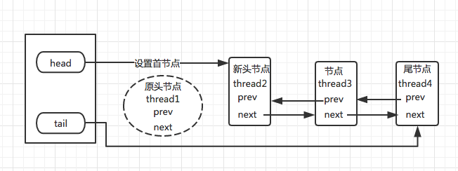 - 同步队列设置首节点(原头节点释放锁,唤醒后继节点):同步队列遵循FIFO,头节点是获取锁(同步状态)成功的节点,头节点在释放同步状态的时候,会唤醒后继节点,而后继节点将会在获取锁(同步状态)成功时候将自己设置为头节点。设置头节点是由获取锁(同步状态)成功的线程来完成的,由于只有一个线程能够获取同步状态,则设置头节点的方法不需要CAS保证,只需要将头节点设置成为原首节点的后继节点 ,并断开原头结点的next引用。如下图,设置首节点: