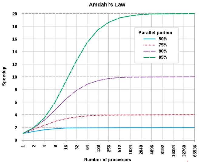 但是最上面的绿色曲线的并行比例是95%,反而言之就是只有5%的串行部分,这样以来在极限情况下就可以达到20倍的提升。