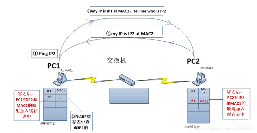 PC2收到这个询问信息后,将这里面的IP1和MAC1(PC1的IP和MAC)添加到本地的ARP缓存表中,然后④PC2发送应答信息,对数据进行IP和MAC的封装,发送给PC2,因为缓存表里已经有PC1的IP和MAC的映射了呢。这个应答信息包含PC2的IP2和MAC2。PC1收到这个应答信息,理所应当的就获取了PC2的MAC地址,并添加到自己的缓存表中。