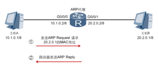 在路由器上启用代理ARP功能,就可以解决这个问题。启用代理后,路由器接收到这样的请求,会查找路由表,如果存在主机B的路由表项,路由器会将自己的G0/0/0接口的MAC地址回应该ARP Requestrian。主机A收到ARP Reply后,将一路有油漆的G0/0/0接口MAC地址作为目的MAC地址进行数据转发。