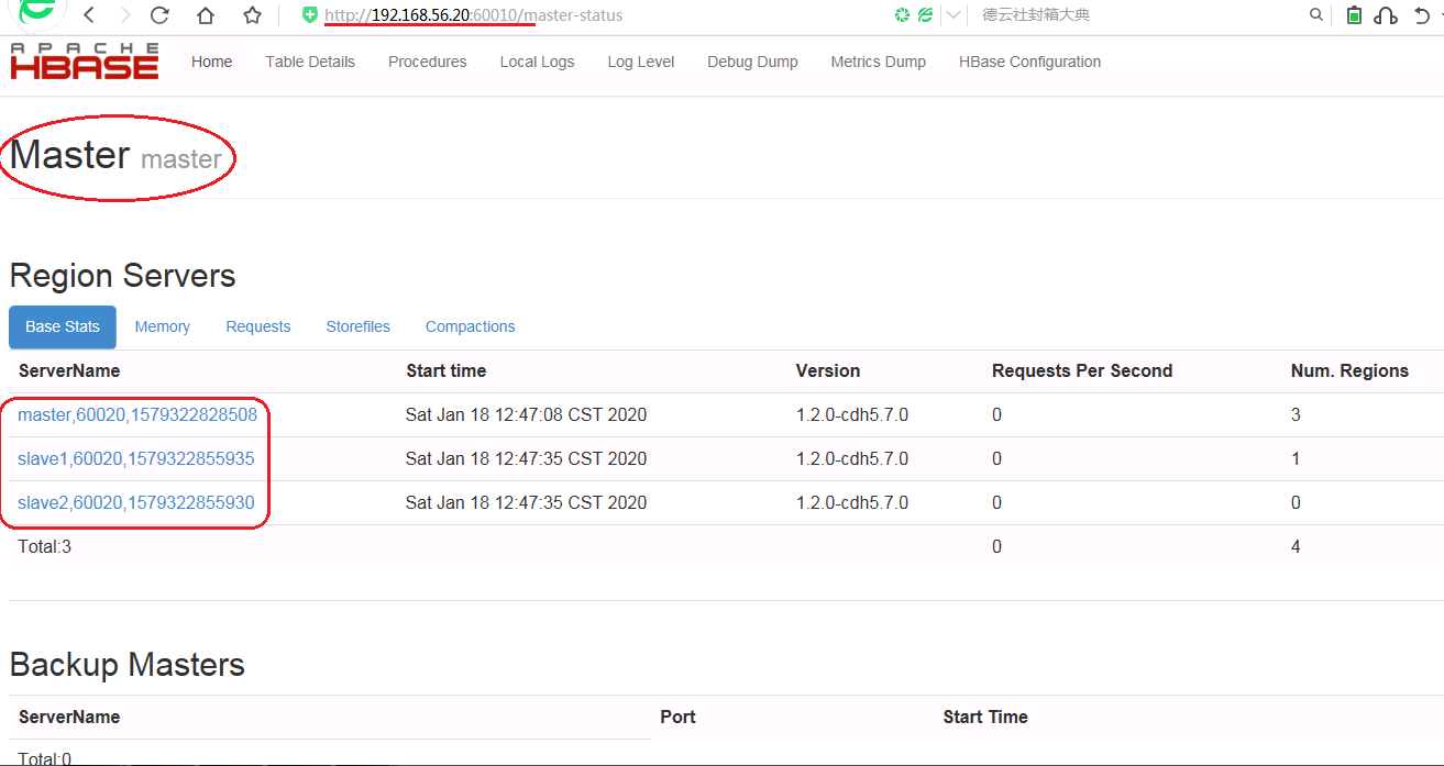 12)在win7下,用chrome浏览器访问HBase自带的web配置网站 http://192.168.56.20:60010 ,能出现如下页面说明访问成功: