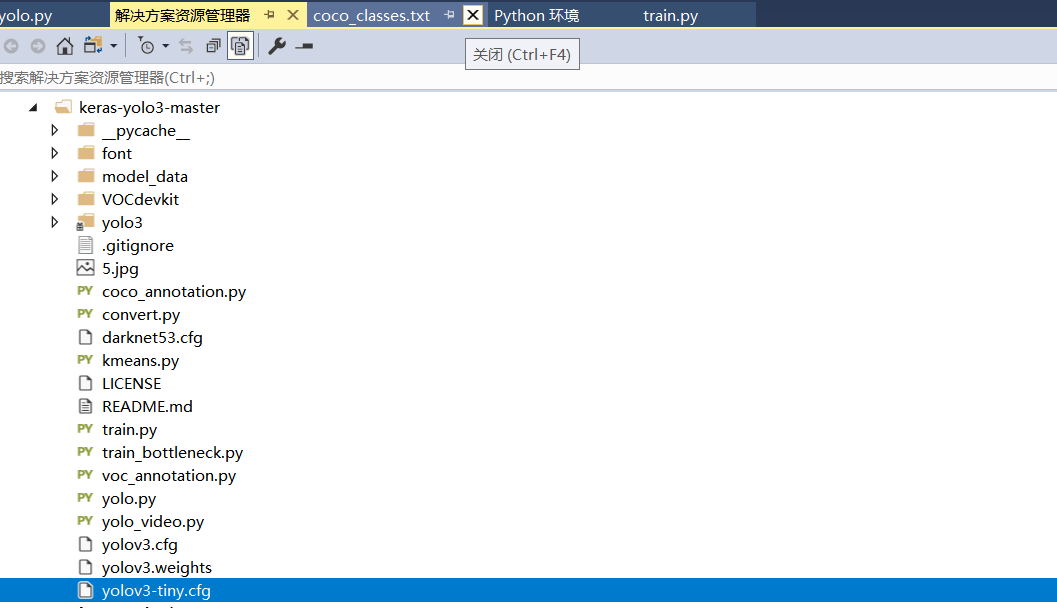 在Vs中,新建项目,在原有python程序上建立,选择下载好的Yolov3的框架文件夹,进行添加。将下载好的Yolov3的权重粘贴复制进项目,完成后页面如下: