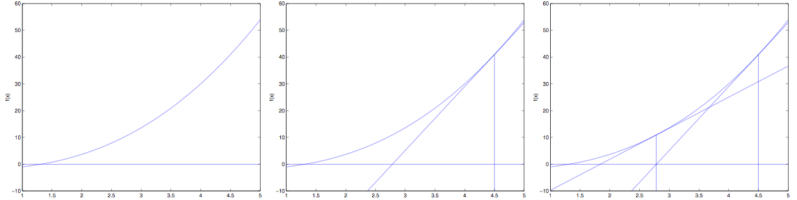 正如上图所示,对于方程f(x)=0,取函数f(x)上一点x0,在(x0, f(x0))处做切线,再取切线与x轴的交点的横坐标x1,再在(x1, f(x1))处做切线,交x轴于x2,如此往复循环,最终在xn处到达函数f(x)的最小值处。牛顿法的几何意义明显,因此也叫切线法。牛顿法的迭代内容可表示为: