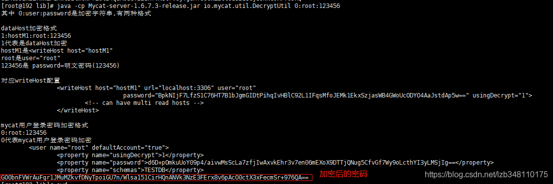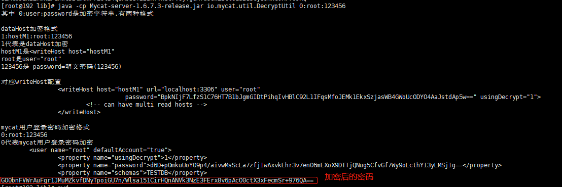 命令:java -cp Mycat-server-1.6.7.3-release.jar io.mycat.util.DecryptUtil 1:hostM1:root:123456