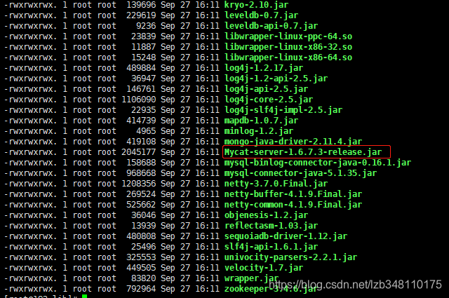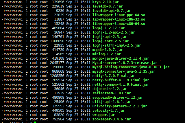 针对这种问题,MyCat 为我们提供了解决方案。我们进入 mycat/lib 目录下,此时我们会看到一个 Mycat-server-xxxxxx 开头的jar 包。