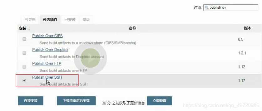 • 检查是否有“Git plugin”和“Publish Over SSH”两个插件,如果没有,则需点击“可选插件”,找到它并安装