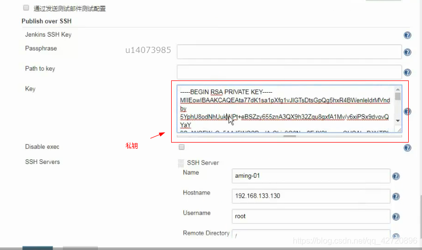 • “Passphrase”填写设置的密码, “Path to key”留空,“key”粘贴/root/.ssh/jenkins文件内容