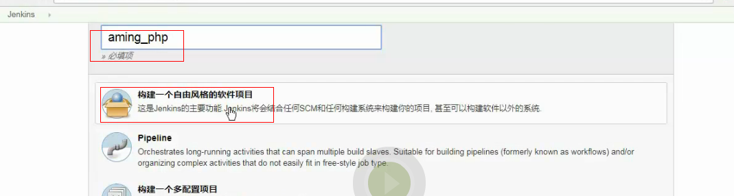• 点击“新建”,任务名称自定义,比如test,选择“构建一个自由风格的软件项目”点击下方的“确定”