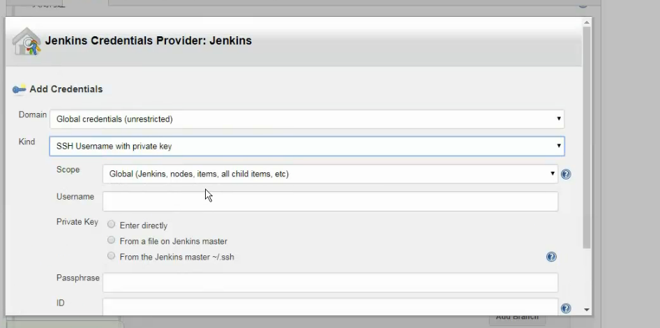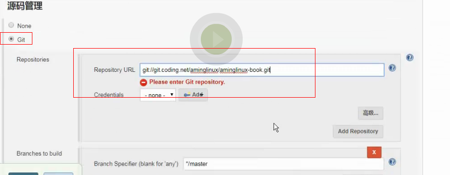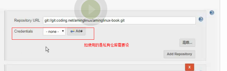 • “Repository URL”填写你项目的git地址,如果是公共项目可以不设置下面的参数,直接填写一个git地址即可,若是私有项目,需要填写认证信息,比如可以选择 “SSH Username whith private key”,然后设置Username以及private key