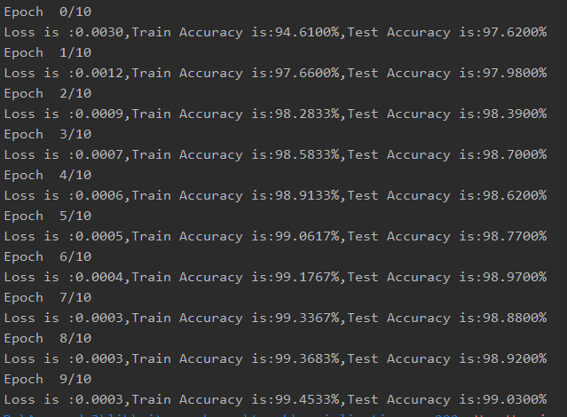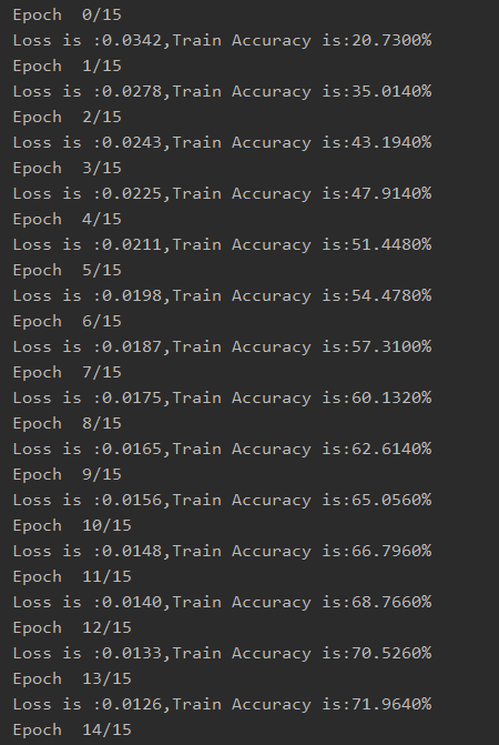 print("Loss is :{:.4f},Train Accuracy is:{:.4f}%".format(running_loss / len(trainset), 100 * running_correct / len(trainset)))