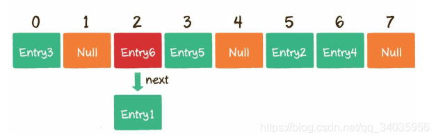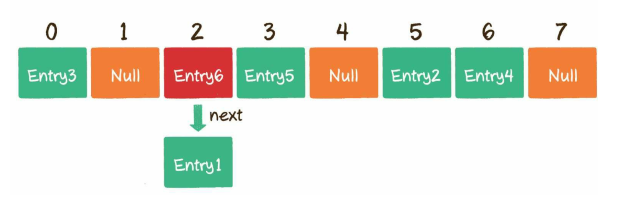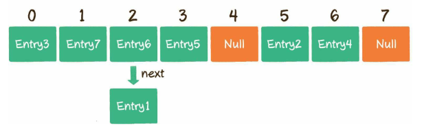 2.链表法:Java的集合类HashMap中有用。HashMap数组中每一个元素是Entry对象,同时也是一个链表的头节点,每个Entry对象通过next指针指向它的下一个Entry节点。当新来的Entry映射到与之冲突的数组位置时,只需要插入对应的链表中即可。