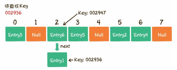 在上图中,首先查到的Entry6的Key是002947,和待查找的Key 002936不符。接着定位到链表下一个节点Entry1,发现Entry1的Key 002936正是我们要寻找的,所以返回Entry1的Value即可。