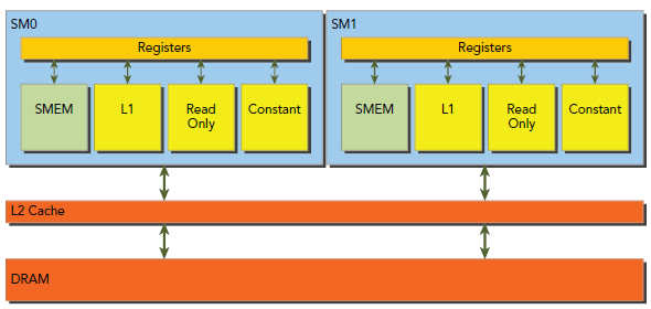 在SM中,数据运送是要经过下面三种cache/buffer的,主要依赖于要获取的device Memory种类: