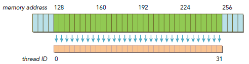 由上文可知,L1 cache中每一行是128bytes,这些数据映射到device Memory上的128位对齐的块。如果warp中每个thread请求一个4-byte的值,那么每次请求会要求获取128 bytes值,正好契合cache line大小和device Memory segment大小。