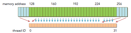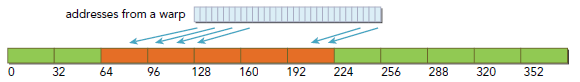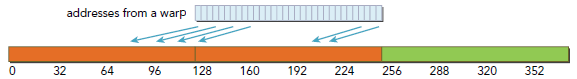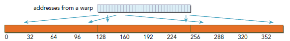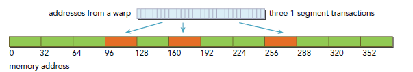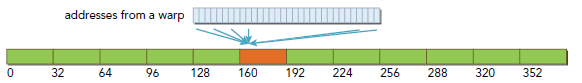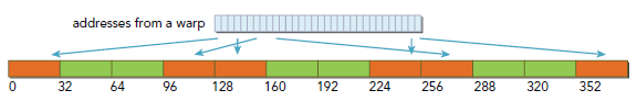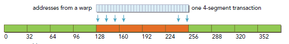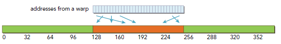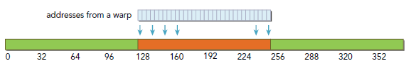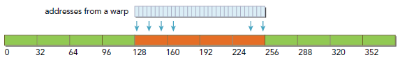 下图则没有遵守连续和对齐原则,有三次传输消耗发生,一次是从偏移地址0开始,一次是从偏移地址256开始,还有一次是从偏移128开始,而这次包含了大部分需要的数据,另外两次则有很多数据并不是需要的,而导致带宽浪费。