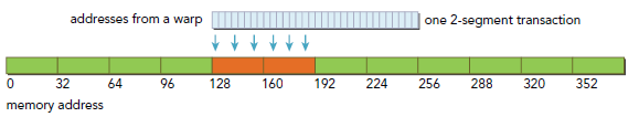 下图是情况最糟糕的,数据非常分散,但是由于所请求的128 bytes落在了多个以32 bytes为单位的segment中,因此无效的数据传输要少的多。
