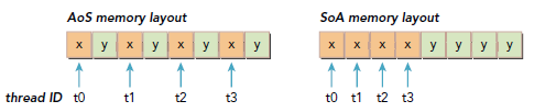 许多并行编程规范里,特别是SIMD-style风格的规范,都更倾向于使用SoA,在CUDA C里,SoA也是非常建议使用的,因为数据已经预先排序连续了。