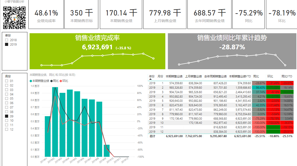 1、数据分析层面:在可视化报告中单独的一个销售业绩指标是没有意义的,只有通过对比指标才能知道销售业绩指标的好坏。对比方法主要通过同指标不同时间的对比,通过PowerBI智能时间函数,可以更加方便的计算累计销售额(YTD),同比(与去年同期对比),环比(与上月对比)等指标。